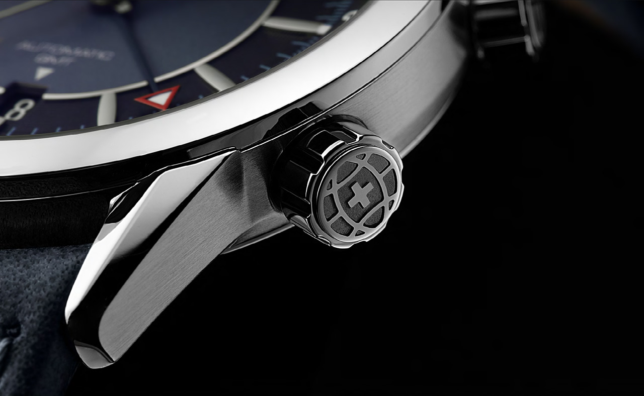 Часовая и минутная стрелки бочкообразной формы в сочетании с накладными индексами обозначают «местное время». Темная стрелка GMT, украшенная заметным треугольным красно-белым наконечником, лаконично отображает время дома. Тонкая центральная секундная стрелка с серебристым наконечником, оснащенная хорошо читаемым леденцом, завершает набор стрелок. И стрелки, и индексы обработаны люминесцентным составом Super-LumiNova®, обеспечивающим читаемость даже при недостаточном освещении.