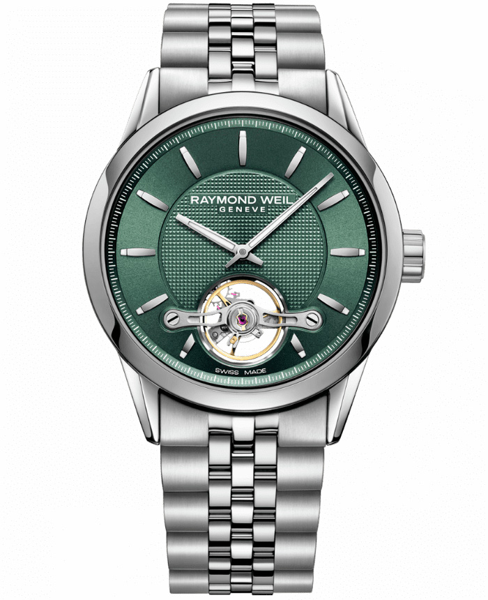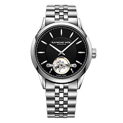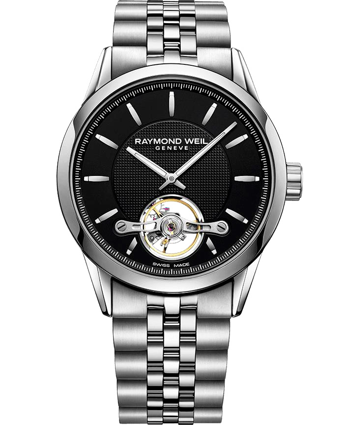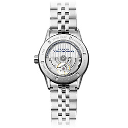 Центральное место в этих часах занимает видимое балансировочное колесо, расположенное над положением «6 часов». Дизайн с открытой диафрагмой подчеркивает индивидуальный механический механизм RAYMOND WEIL с автоматическим заводом.