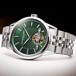 Эта последняя модель из коллекции freelancer имеет 42-миллиметровый циферблат из нержавеющей стали, обрамленный зеленым атласным кольцом chapter с серебряными индексами, Парижским клубом в центре и секундной стрелкой снаружи.
