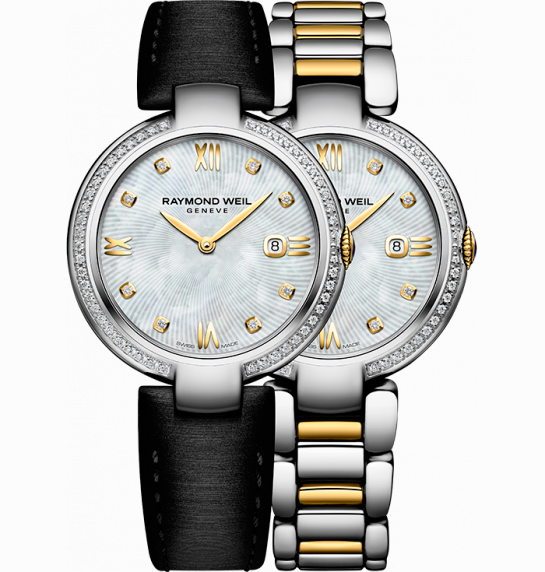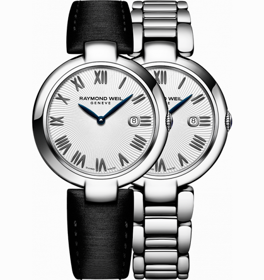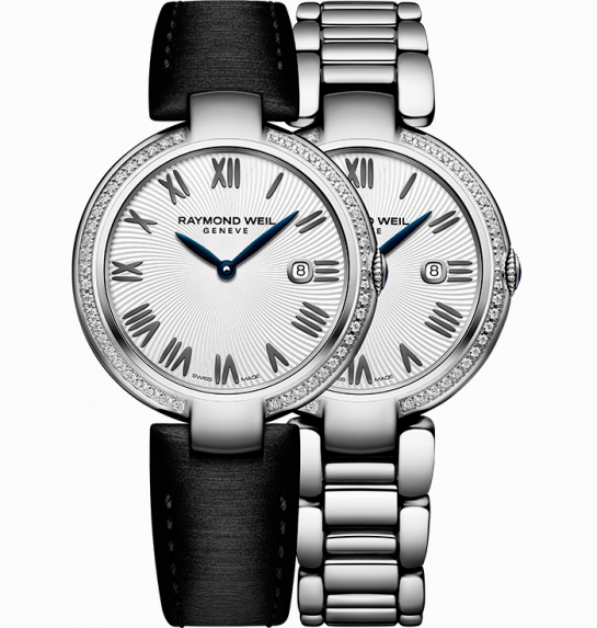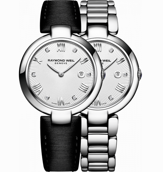 Циферблат часов «Raymond Weil Shine Ladies» с центральными листовидными стрелками часов и минут и окошечком даты на отметке «3 часа» имеет несколько вариантов исполнения: