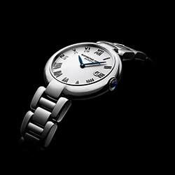 - серебристый циферблат с условными часовыми бриллиантовыми индексами, стальными римскими цифрами (II, IIII, VI, VIII, X, XII) и серебристыми стальными стрелками;
