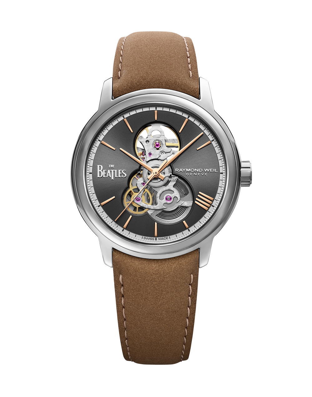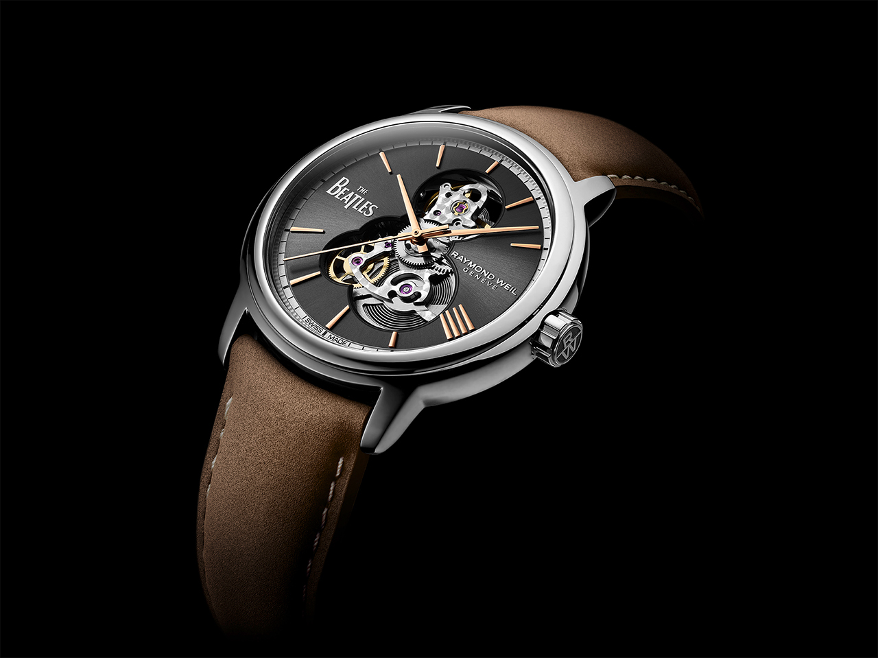 Антрацитовый циферблат контрастирует со стрелками и часовыми метками с PVD-покрытием розовым золотом, а указатель с четырьмя совмещенными индексами, расположенными на отметке «4 часа», представляет четырех участников The Beatles. Официальный логотип The Beatles расположен у отметки «9 часов» и на задней крышке корпуса, а логотип RAYMOND WEIL в положении «3 часа».