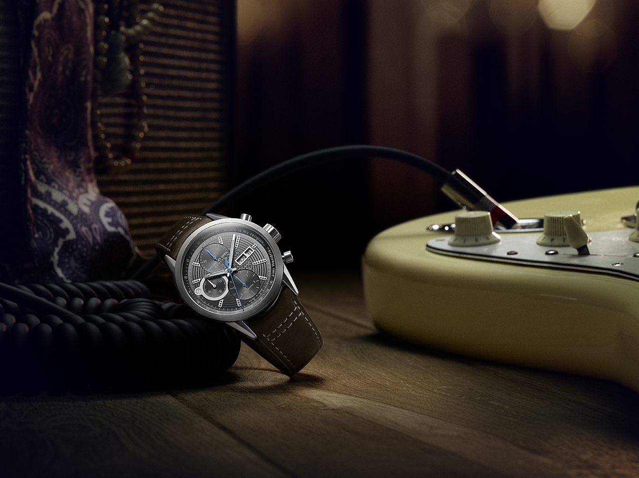 Бренд RAYMOND WEIL избрал свою флагманскую коллекцию freelancer, чтобы отразить в ее часах свободолюбивый дух Джими Хендрикса и элементы его стиля, ставшего классикой. О знаменитой белой гитаре Fender Stratocaster, на которой он играл в 1968 году, напоминают многие детали циферблата. Это девять часовых индексов с точками в виде ладов на грифе гитары и круговые линии, похожие на шесть гитарных струн.