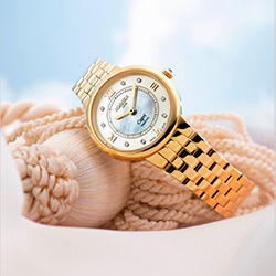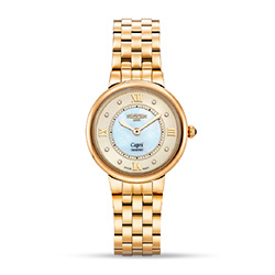 Часы Capri Diamond сочетают в себе блеск перламутра, сияние 8 бриллиантов и утончённый стиль модели. Внутренний циферблат выполнен из изысканного белого перламутра, окружённого лаконичной минутной шкалой. Римские цифры придают дополнительную элегантность циферблату.