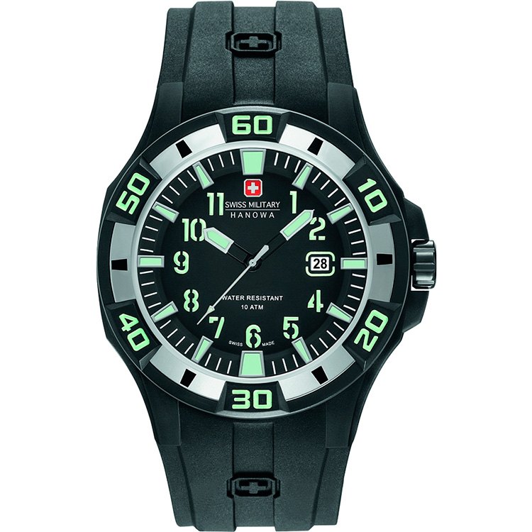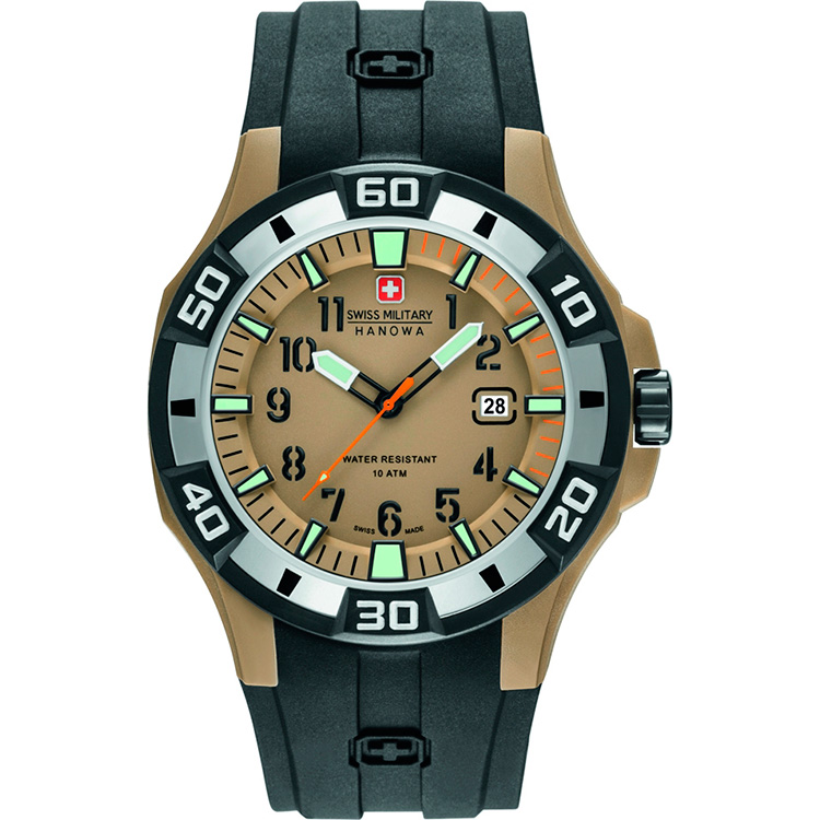 На выполненном в тактическом стиле циферблате светло-серого, песочного или чёрного цвета расположены центральные широкие наполовину скелетонированные стрелки часов и минут, тонкая (синяя, красная, белая или оранжевая) секундная стрелка, белые условные часовые индексы, трафаретные арабские цифры (1,2,4,5,6,7,8,9,10) белого или чёрного цвета и окошко даты на отметке «3 часа». Часовая и минутная стрелки, а также условные индексы и цифры обработаны люминесцентным составом. На циферблате также имеются: логотип марки в виде швейцарского белого креста на красном фоне (на отметке «12 часов») и надписи: «Swiss Military Hanowa – Water Resistant 10 Atm – Swiss Made».