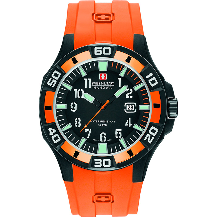 4. Swiss Military Hanowa Navy Bermuda 06-4292.27.007.79 Корпус из нержавеющей стали с покрытием из поликарбоната чёрного цвета, оранжевый безель. Чёрный циферблат с белыми цифрами и оранжевой секундной стрелкой. Силиконовый ремешок оранжевого цвета. |