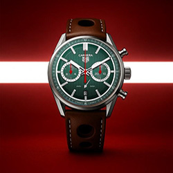 В честь события представлена лимитированная модель TAG Heuer Carrera Chronograph x Festival of Speed. Часы выполнены в культовом стиле автоспорта: циферблат British Racing Green, красные акценты и коричневый кожаный ремешок в стиле rally. Корпус диаметром 42 мм сохраняет классические пропорции Carrera, подчёркивая гоночное наследие бренда. Модель выпущена ограниченным тиражом и изначально доступна членам Goodwood Road Racing Club, что делает её особенно желанной для коллекционеров.