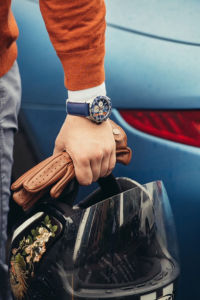 Часы ограниченной серии Monaco Gulf в знаменитом квадратном корпусе диаметром 39 мм и с циферблатом темно-синего цвета также выполнены в узнаваемых цветах компании Gulf – синем и оранжевом. На задней крышке корпуса нанесена эмблема годовщины Gulf и номер изделия XX/50.