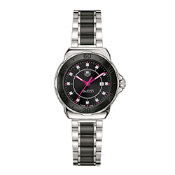 Устойчивое к царапинам сапфировое стекло надёжно защищает чёрный циферблат, на котором, в качестве условных часовых индексов, расположены 12 фирменных бриллиантов «Wesselton» (0,09 карата), оттеняемых таким же количеством розовых декоративных вкраплений. На циферблате установлены центральные тонкие гранёные родиевые бело-розовые стрелки часов и минут с люминесцентными вставками, изящная розовая центральная стрелка секунд, рельефный монохромный логотип «TAG Heuer» и окошечко даты: на линии контрастной тонкой белой окружности левее отметки «3 часа».