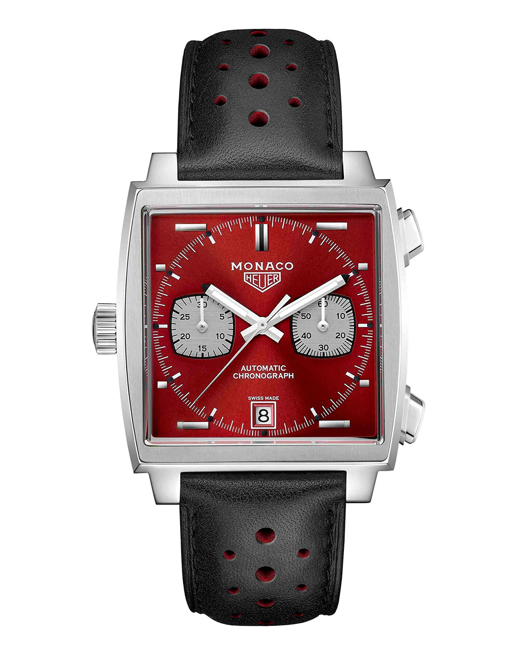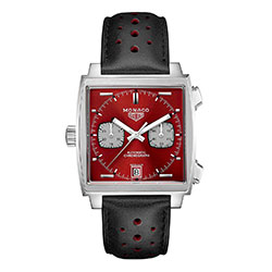 Вторые из пяти коллекционных моделей TAG Heuer отличаются огненно-красным циферблатом, который созвучен передовому дизайну и гоночному духу. Представленные на черном кожаном ремешке с перфорацией красного цвета, эти часы отражают стиль второй декады эпохи Monaco. Знаковый квадратный корпус из нержавеющей стали дополнен красным циферблатом с узором sunray, двумя квадратными счетчиками со скругленными краями с родиевым покрытием. Черно-белые акценты на циферблате отлично сочетаются с чернеными минутной и часовой стрелками. Стрелки и метки покрыты Super-Luminova® для лучшей считываемости показателей.