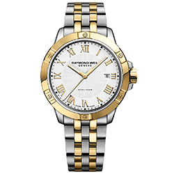 Женские и мужские модели Tango в корпусе диаметром 30 и 41 мм, с хронографом (диаметр 43 мм), водонепроницаемостью 100 и 300 метров соответственно и тремя стрелками выполнены в двух вариантах – полностью из стали или из золота двух цветов с PVD-покрытием. При разработке обновленной коллекции перед мастерами RAYMOND WEIL стояла задача сохранить индивидуальный стиль Tango. И им это удалось. Уникальный безель дополнен ритмичным орнаментом в виде литых винтов, что служит данью историческому дизайну оригинальной коллекции 1995 года. Циферблат часов украшает рисунок в форме звезды и накладные римские цифры, а также окошко даты на отметке «3 часа». На роскошном перламутровом циферблате женской модели размещены алмазные часовые метки. Идея мужского и женского обыграна в корпусе за счет сочетания металлического браслета из пяти звеньев, в котором холодный блеск стали сочетается с теплым свечением желтого золота с PVD-покрытием. Красота танго, танца с бесконечным сочетанием шагов и композиций, воплощена в богатом многообразии линейки Tango.