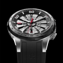 - модель, облачённая в стальной корпус с покрытием из алмазоподобного карбона, с чёрной титановой турбиной на циферблате, с арабскими цифрами и условными индексами чёрного цвета, с внутренним циферблатом и ободком чёрного цвета;