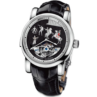 Также, в прошлом году, новыми моделями пополнилась и та линия часов, в которых используются фигурки жакемаров. Циферблаты часов «Ulysse Nardin» уже играли роль «ристалища» восточных воинов, становились «ареной» для артистов цирка и даже превращались в таинственные «джунгли» с экзотическими животными. Теперь же циферблат часов «Alexander the Great» превратился в «поле битвы» пяти, изготовленных вручную фигурок воинов представленных в различные моменты сражения. В тот момент, когда минутный репетир отбивает минуты, четверти часа и час, фигурки воинов начинают совершать движения: один из ратников взмахивает саблей, другой – в красной броне – делает замах мечом, лучник прицеливается, собирается в атаку всадник с копьем, а воин готовый к нападению, в левой части циферблата, остается неподвижным. Циферблат новых часов, ставший местом «сражения», выполнен из искусственного бриллианта насыщенного чёрного цвета. Этот бриллиант был создан посредством выращивания миллионов маленьких шлифованных кристаллов, которые впоследствии сформировали однородную поверхность.