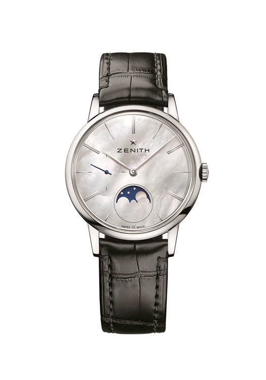 Новинка представлена пятью альтернативными по материалам изготовления и отделке моделями, при создании которых использовались нержавеющая сталь, розовое золото 750-й пробы, перламутр, а в качестве усложнения был выбран указатель лунных фаз. Все пять моделей демонстрируют образцовое сочетание лаконичных форм, свободных плавных линий и высочайшего технического и художественного мастерства преподнося, тем самым, образец истинной женственности в понимании марки «Zenith».
